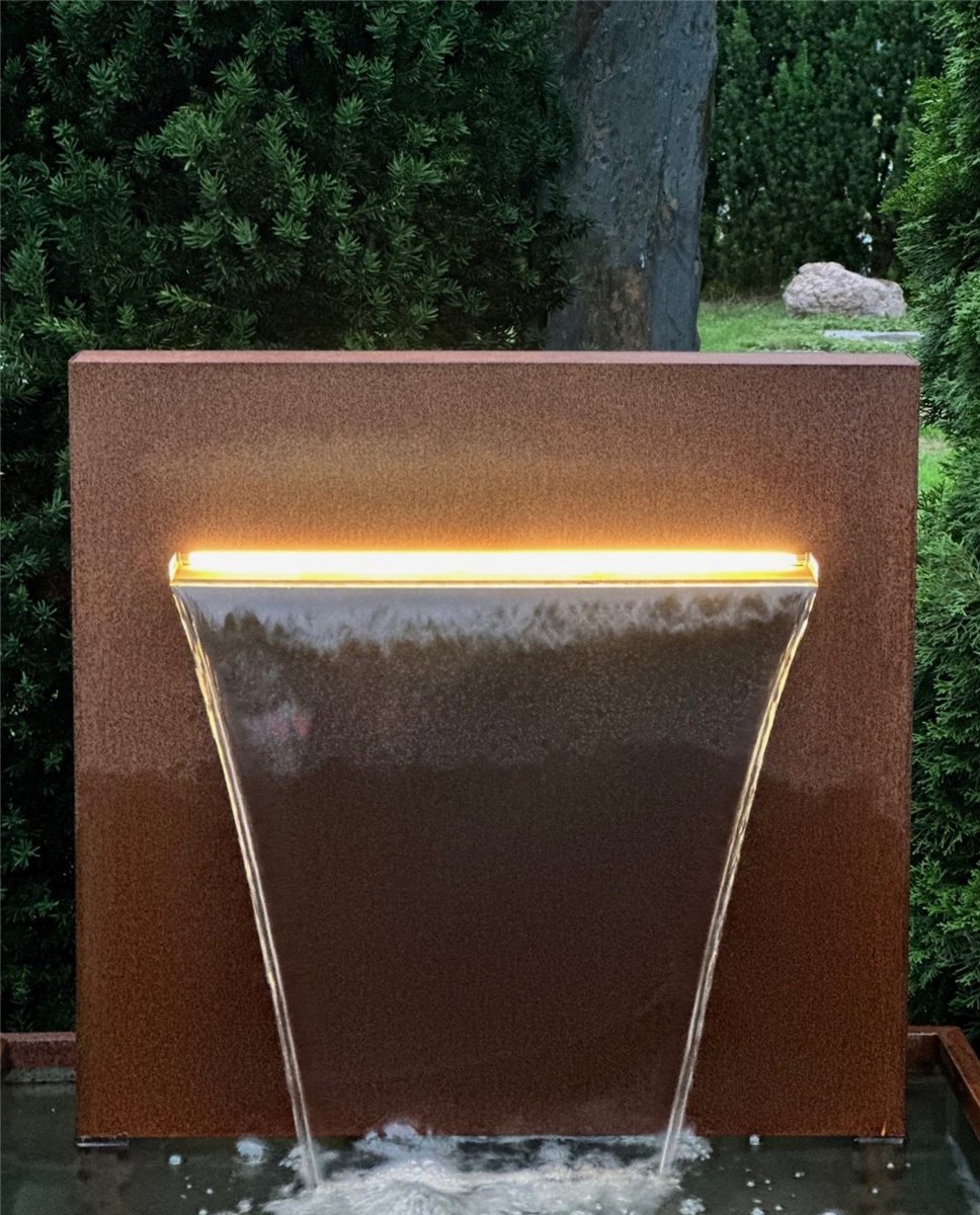 - Der moderne Edelrost Wasserfall ist ein Deutsches Qualitätsprodukt und entsteht in hochwertiger Handwerksarbeit in den Werkstätten der BRUNNENSCHMIEDE, dabei wird ausschließlich Deutsches Cortenstahl höchster Güte in mind. 3 mm Materialstärke verarbeitet