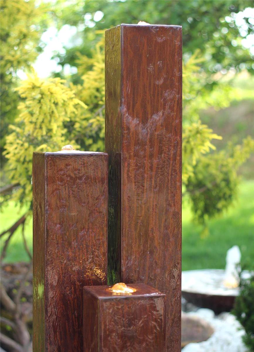 Quellsäulen Trio 160 abgestuft fest verschweißt auf Edelstahl Standfuß Material: Hochwertiger Cortenstahl Maße (LxBxH): ca. 15x15x100/130/160 cm PE Becken mit GFK Deckel: Durchmesser: ca. 90 cm Höhe: ca. 35 cm Inhalt: ca. 150 Liter Pumpensystem Standard Stromkabellänge: 10 m
