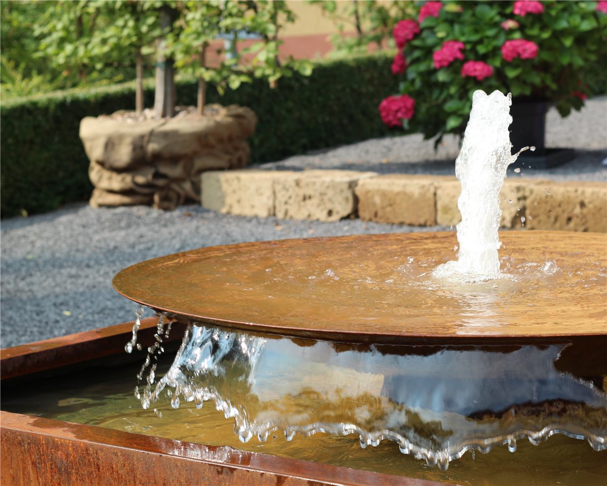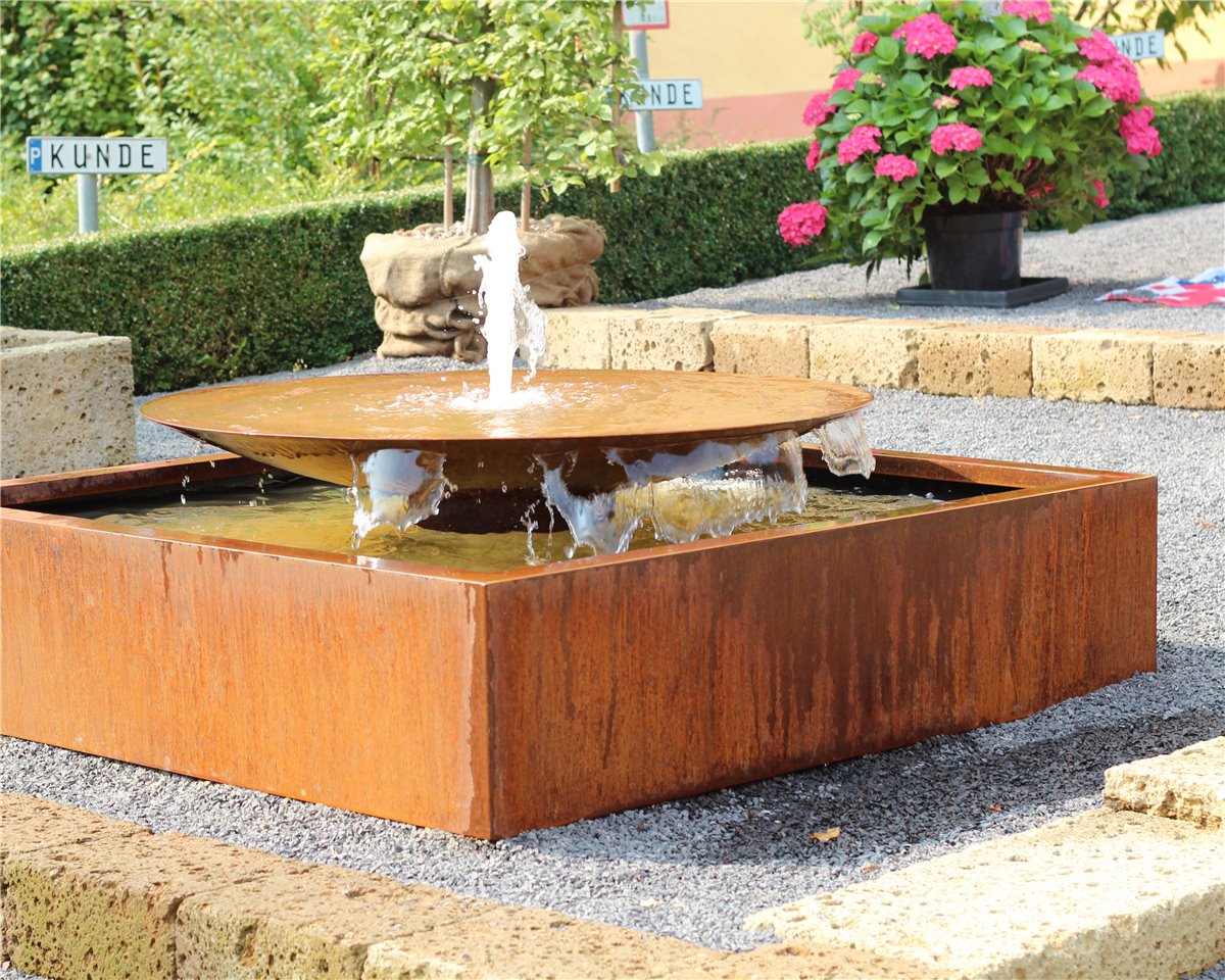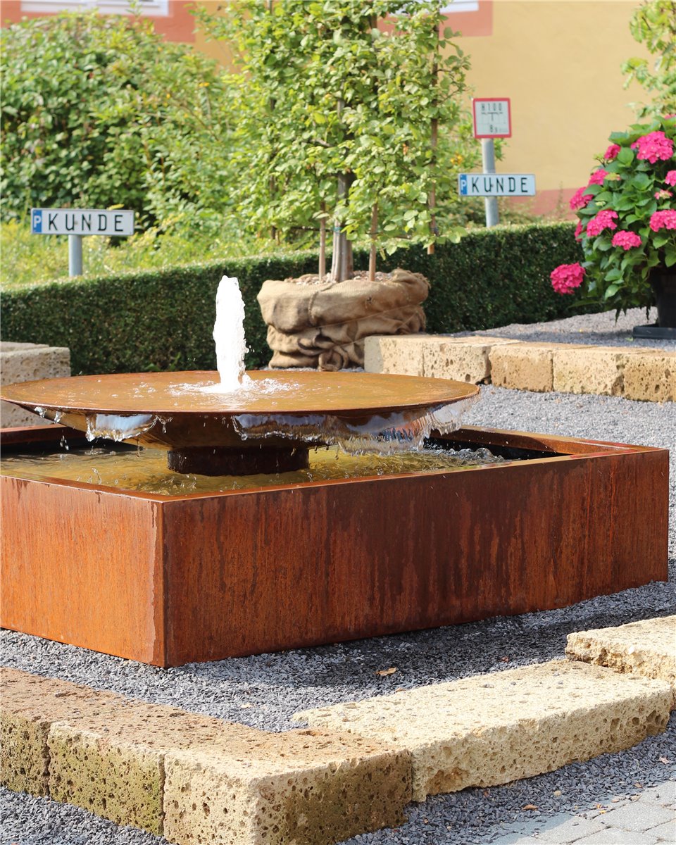 - Cortenstahl bildet auf der Oberfläche durch Bewitterung unter der eigentlichen Rostschicht eine besonders dichte Sperrschicht, welche das Material vor weiterer Korrosion schützt. Die charakteristische Edelrost Patina entwickelt sich in erdigen Farbtönen, Farb- und Zeichnungsunterschiede sind natürlich und machen jeden Brunnen einzigartig