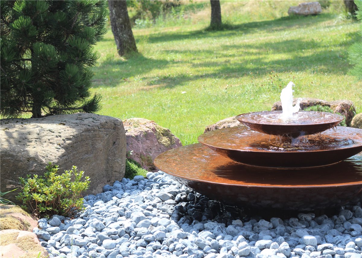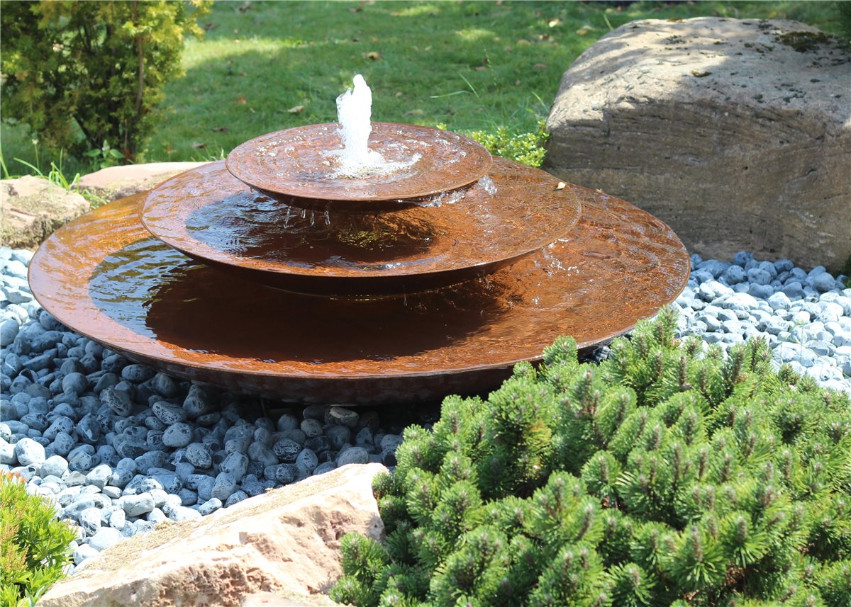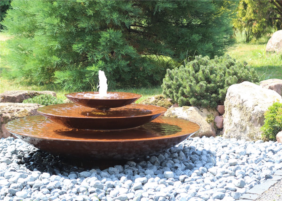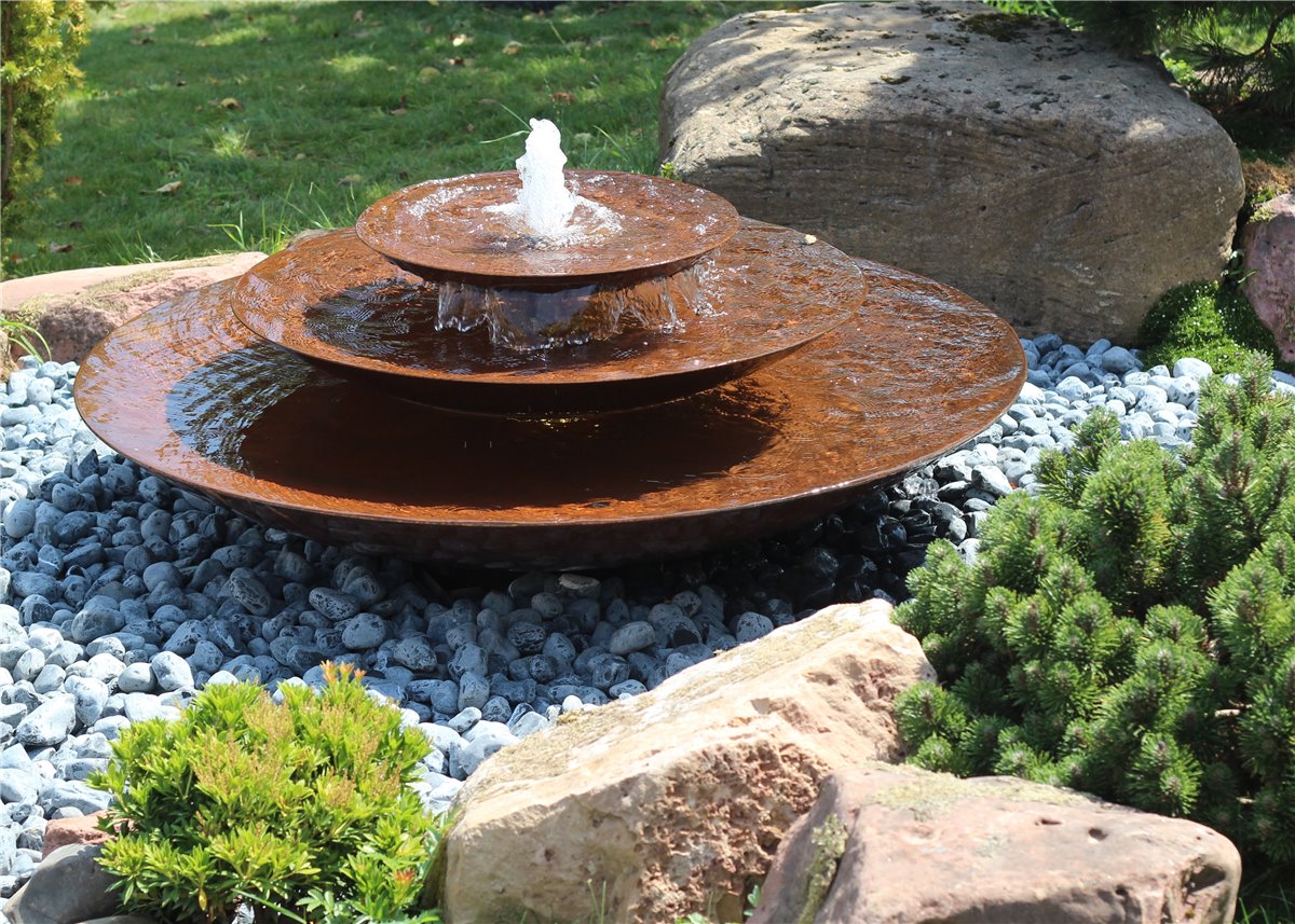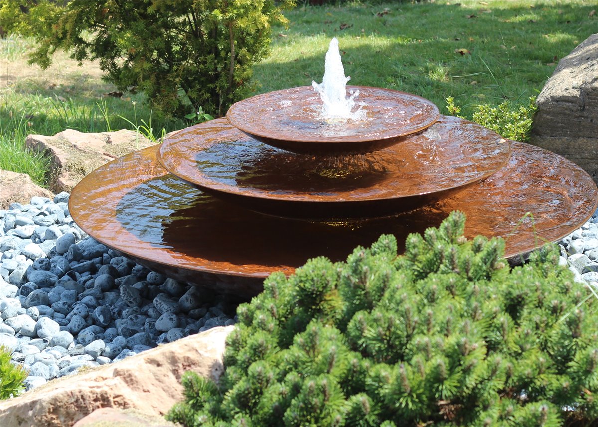Cortenstahl Wasserschalen Kaskade Trio Ø150cm mit Fontäne Edelrost Springbrunnen Komplettset
