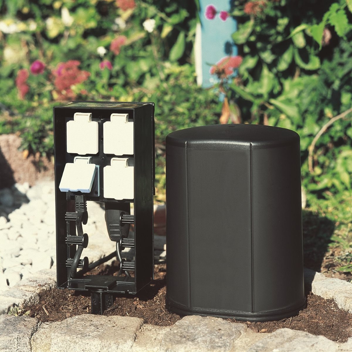 - Ganzjähriger Einsatz dank spritzwassergeschützter und zugentlasteter Steckdosen