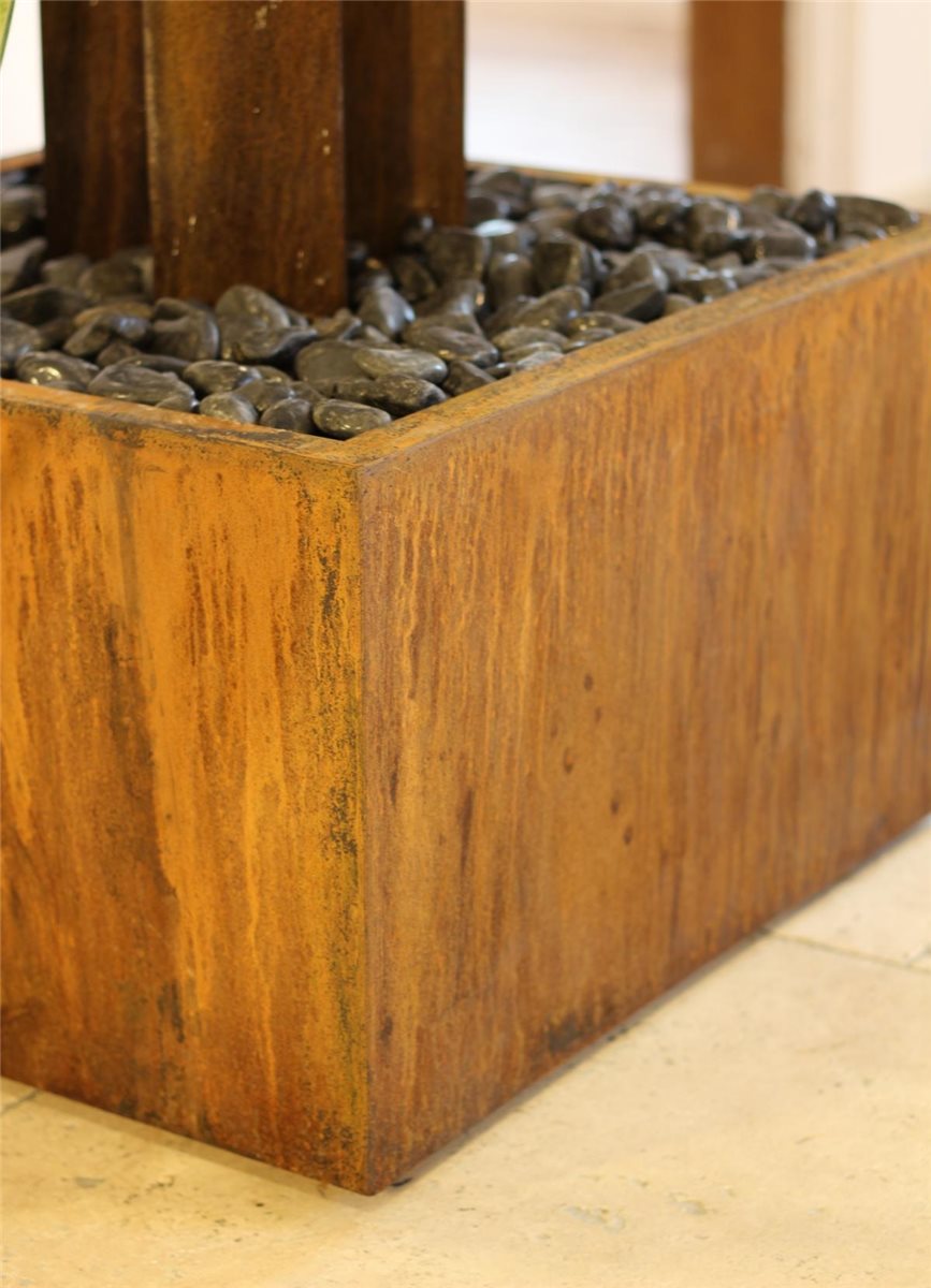 - Die für Cortenstahl charakteristische Edelrost Patina entwickelt sich in erdigen Farbtönen, Farb- und Zeichnungsunterschiede sind natürlich und machen jeden Brunnen einzigartig
