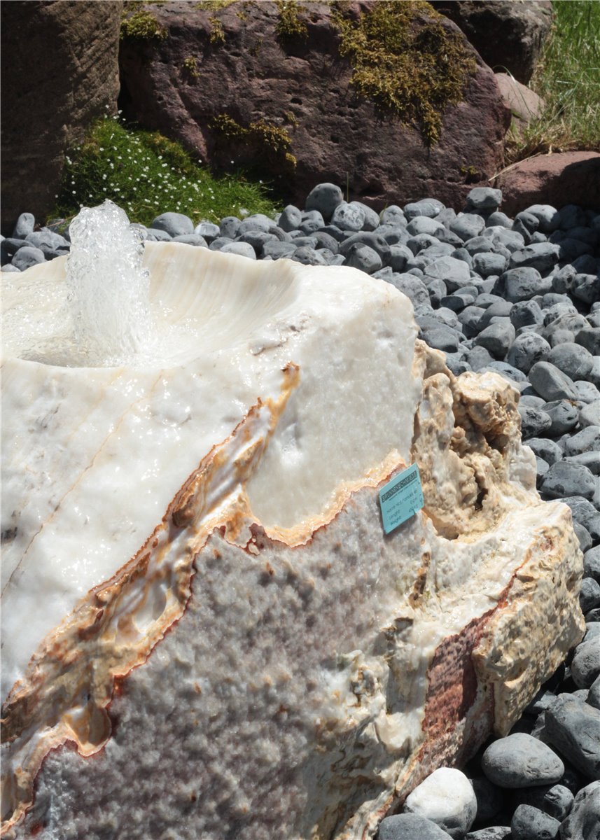 - Das Wasser entspringt oben aus der Quelle und läuft im Stil eines Bachlaufs die ausgearbeiteten Quellschalen herab