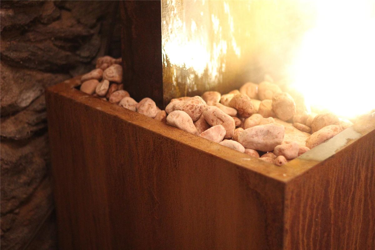- Die für Cortenstahl charakteristische Edelrost Patina entwickelt sich in erdigen Farbtönen, Farb- und Zeichnungsunterschiede sind natürlich und machen jeden Brunnen einzigartig