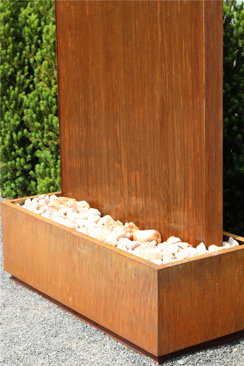 - Cortenstahl bildet auf der Oberfläche durch Bewitterung - unter der eigentlichen Rostschicht - eine besonders dichte Sperrschicht, welche den Brunnen vor weiterer Korrosion schützt